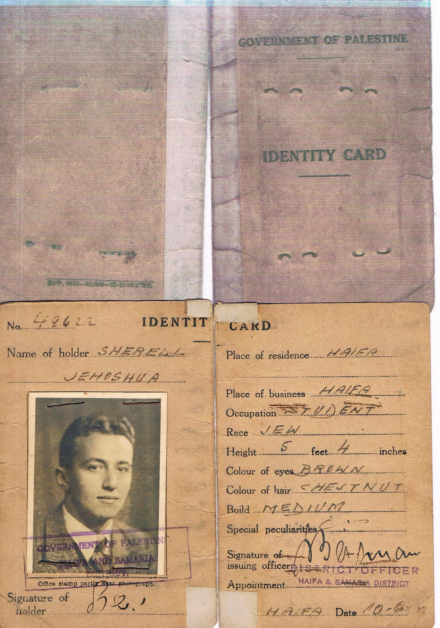 The UK’s Government of Palestine circulated Palestine banknotes and coins with the Hebrew Palestine followed by letters Alef Yod אי signifying Land of Israel in Hebrew. It issued ‘Government of Palestine’ identity cards. Here, for example, is the Government ID card from the 1930s of Jehoshua Sherell resident of Haifa. It is stamped ‘Haifa and Samaria District.’